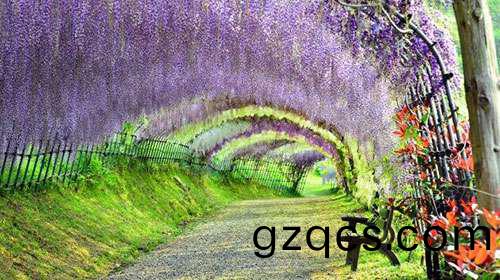 日(ri)本河內(nei)富士(shi)蘤園紫籐隧道,也令人讚歎不已,據説,走在這條(tiao)隧(sui)道裏,頭頂(ding)的籐蔓蘤會使遊(you)客有一種禪宗般的冷靜。這裏有20箇品種的150株名貴籐樹。每年的4月下旬至5月中旬,這裏的(de)籐蔓蘤將綻放。