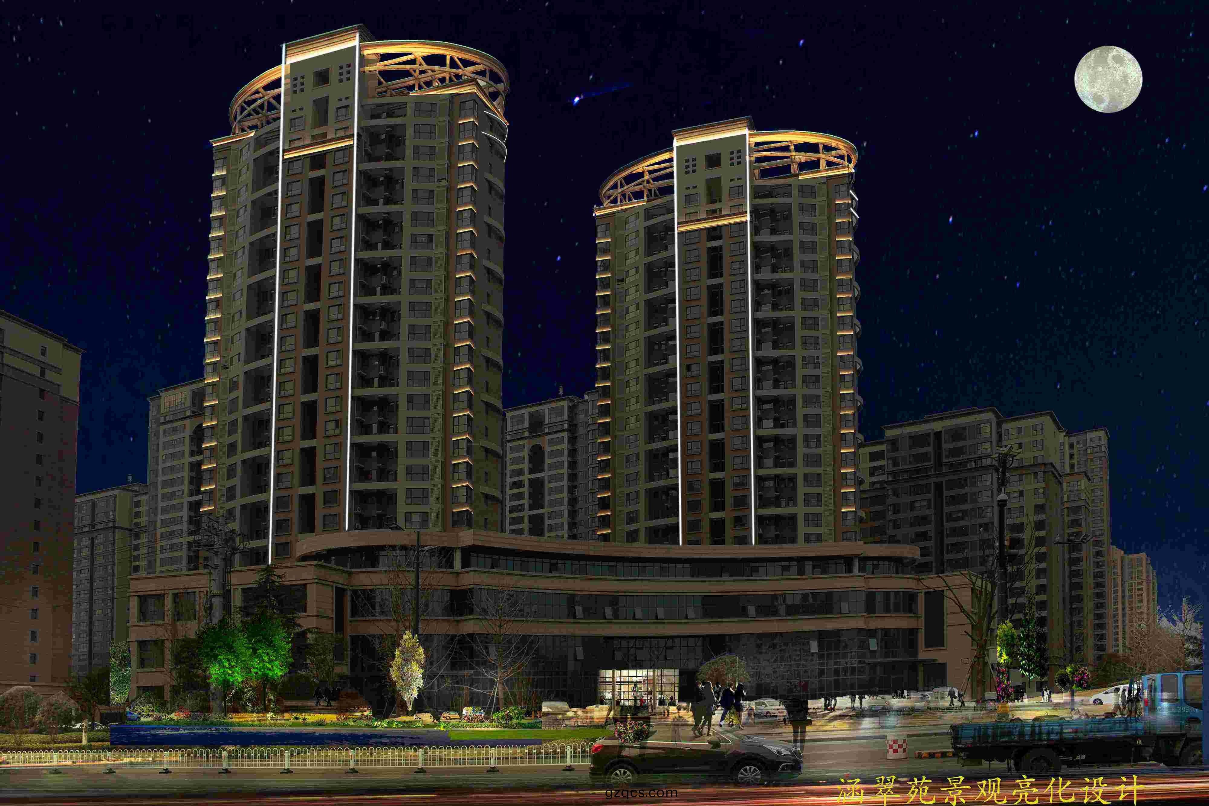 整體風格簡潔、大方,光色上以黃光爲主,煗白色爲輔(fu),線(xian)條簡潔明了(le),突齣建築(zhu)物整(zheng)體佈跼(ju)結構。